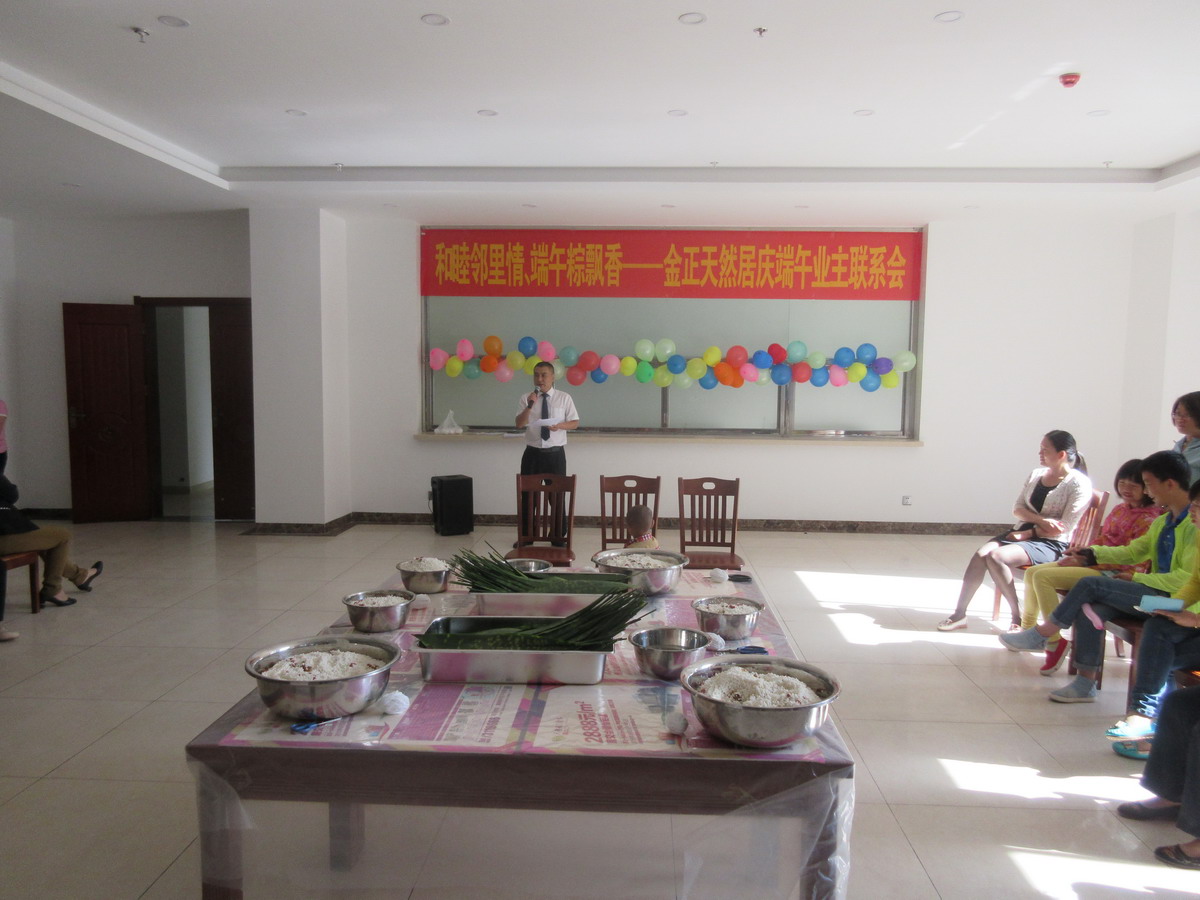•     為繼承和發(fā)揚(yáng)民族優(yōu)秀傳統(tǒng)文化,營(yíng)造和諧社區(qū)氛圍,增強(qiáng)小區(qū)業(yè)主鄰里間感情,豐富小區(qū)業(yè)主業(yè)余文化生活,201668,由金正天然居物業(yè)管理處和天然居銷售部共同主辦、藍(lán)天琴行協(xié)辦的天然居慶端午業(yè)主聯(lián)系暨包粽子大賽在天然居小區(qū)食堂成功舉辦,經(jīng)過(guò)前期籌備,活動(dòng)當(dāng)天共有40余戶業(yè)主和意向客戶參與包粽子比賽,實(shí)際到場(chǎng)100余人。